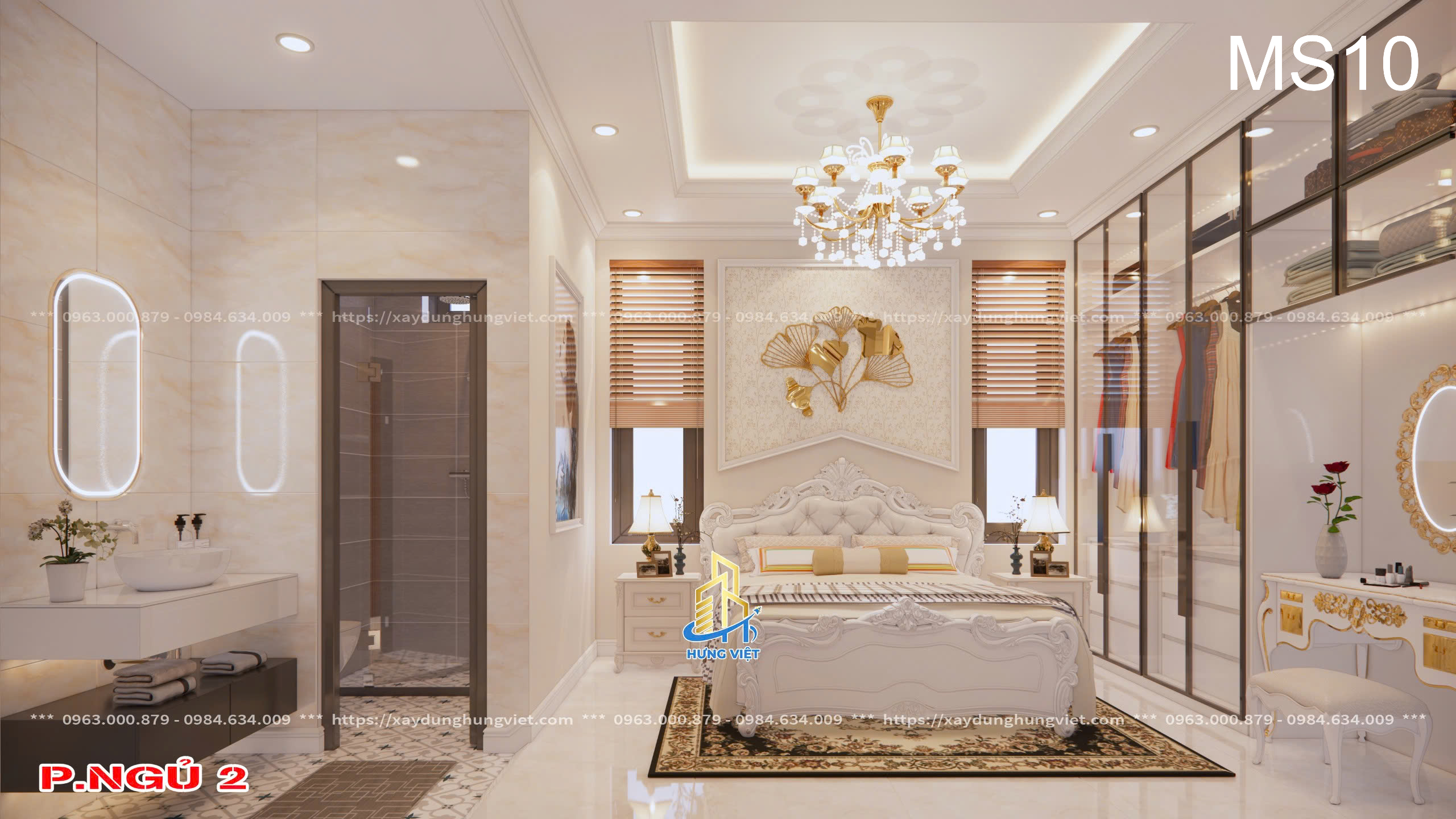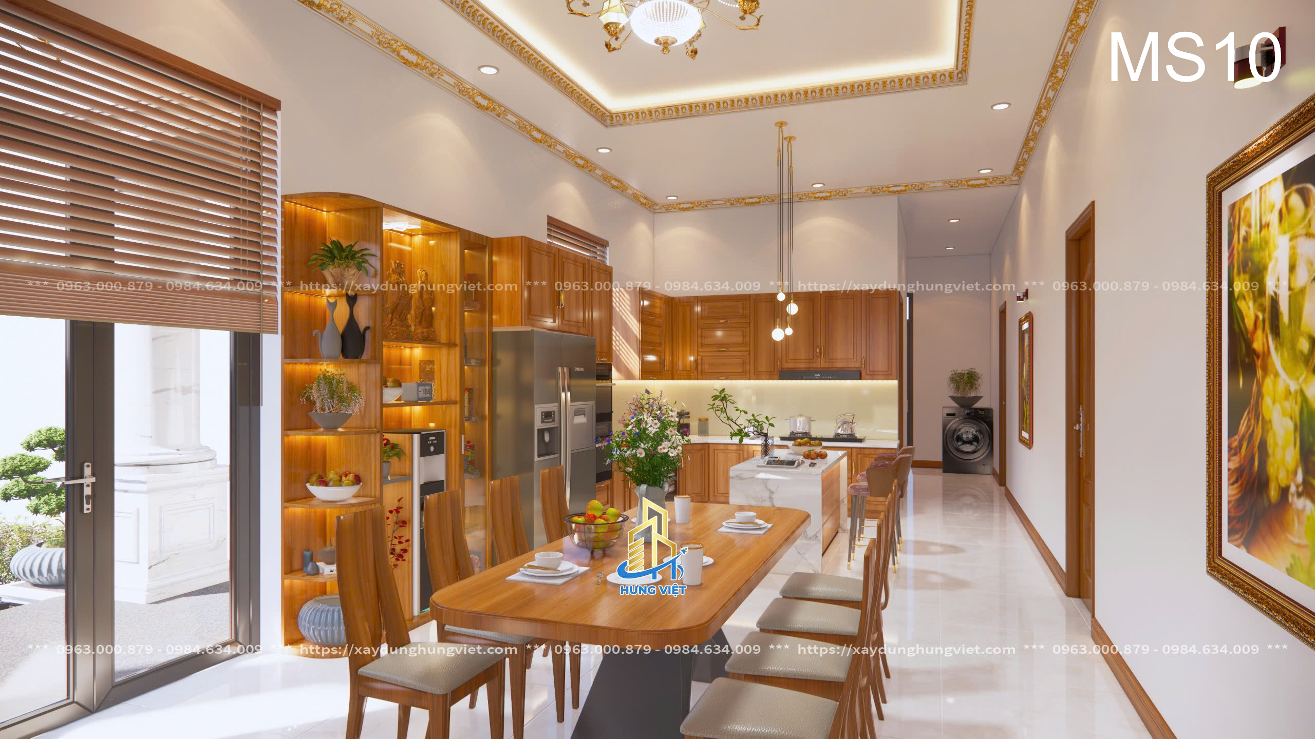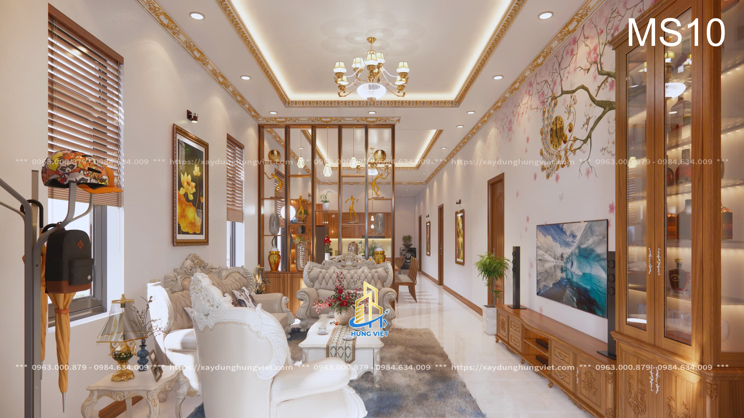 Mỗi chi tiết trong biệt thự của anh Hùng đều được Xây Dựng Hưng Việt chăm chút kỹ lưỡng, từ hệ thống đèn chiếu sáng cho đến cách bố trí các phòng chức năng. Màu sắc chủ đạo của căn nhà là sự kết hợp hài hòa giữa tông trắng và nâu gỗ, mang lại vẻ đẹp sang trọng, trang nhã và đầy ấm cúng. Những chi tiết trang trí tinh xảo trên tường, trần nhà cũng được đầu tư kỹ lưỡng để phù hợp với phong cách cổ điển kết hợp hiện đại của biệt thự.
