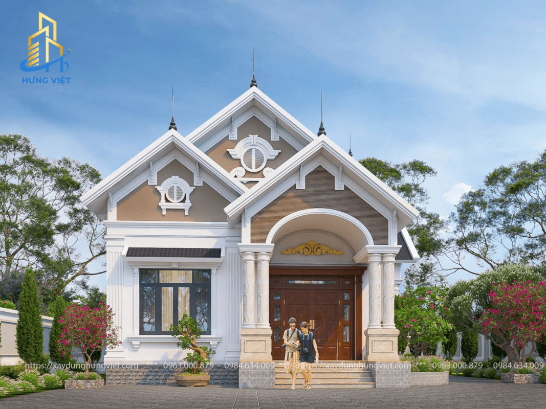 Ngoại Thất: Ngôi nhà nổi bật với thiết kế mái Thái truyền thống, kết hợp với các chi tiết hiện đại. Mặt tiền ngôi nhà được chăm chút kỹ lưỡng với cửa chính lớn, hai cột trụ trang trí đỡ vòm mái, tạo nên vẻ đẹp bề thế và vững chãi. Tông màu chủ đạo trắng kết hợp với mái ngói đen, cùng các khung cửa sổ trang trí tạo nên sự hài hòa và tinh tế. Ban công nhỏ với lan can sắt uốn lượn phía trước nhà là điểm nhấn ấn tượng cho ngôi nhà.
