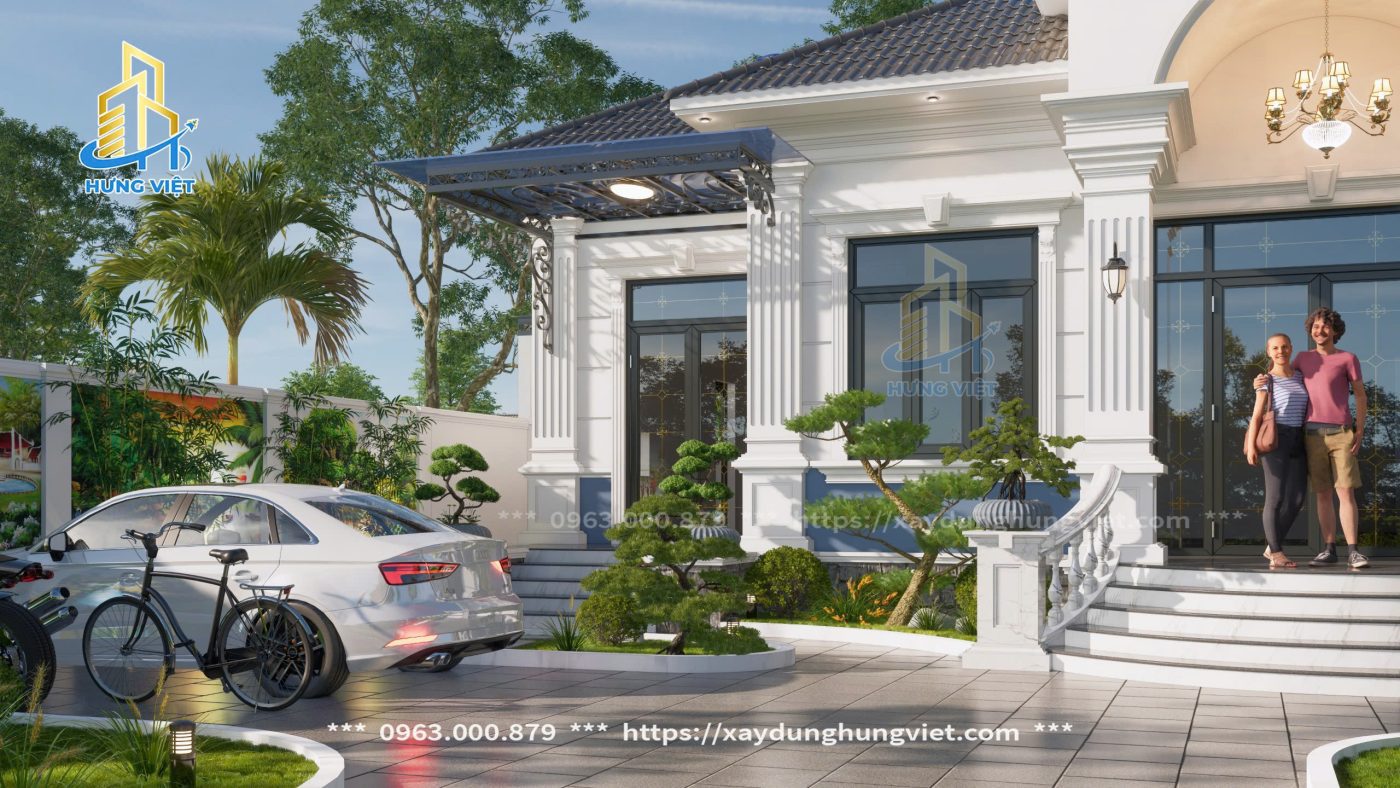 Gara ô tô đặt ở phía trái mặt tiền, thiết kế mái kính polycarbonate chịu lực cao, giúp che nắng mưa mà vẫn đảm bảo thông thoáng.